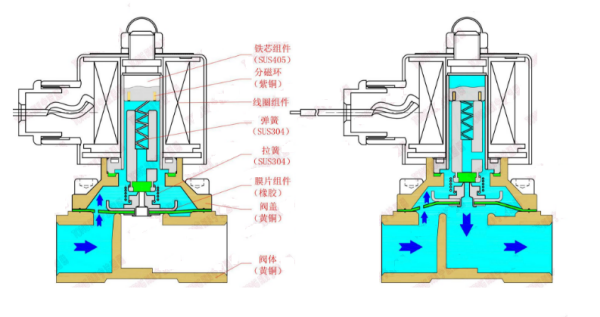 电磁换向阀是电磁阀的一种类型。 阀门:是流体输送系统中的控制部件,具有截止、调节、导流、防止逆流、稳压、分流或溢流泄压等功能。 电磁阀:是用电磁控制的阀门,是用来控制流体的自动化基础元件之一。泛指所有用电磁控制的阀门;特指(与其它具有说明的电磁阀,如三通电磁阀、电磁幻象阀……并列的情况下)仅具有截止、导流功能的电磁阀。 电磁换向阀:泛指可以控制介质流向的电磁阀。特指液压、气动控制系统中用于实现控制逻辑的换向阀。 下图分别为某种电磁阀和电磁换向阀的结构示意